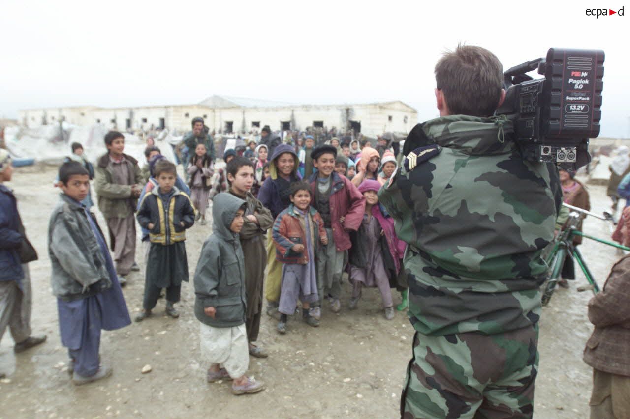 - Camp de réfugiés afghans à Mazar e Charif. Le sergent-chef, caméraman de l'ECPAD (Etablissement de communication et de production de la Défense), filme les enfants.