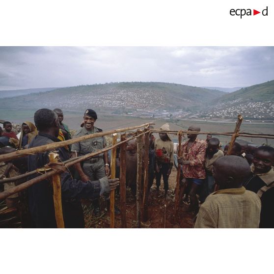 Camp de réfugiés de Nyacyonga sur la route de Byumba à 10 km de Kigali. Militaire français parmi les réfugiés et tentant de sympathiser avec les enfants.
