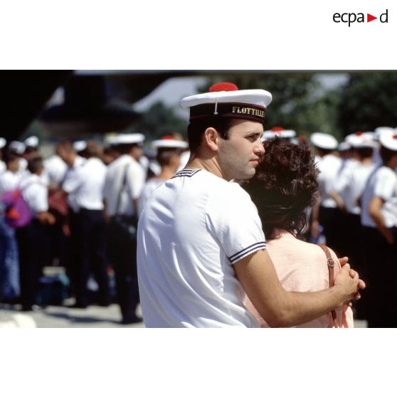 Départ des marins embarquant sur le PA (porte-avions) Clemenceau. Adieu aux familles sur le quai.