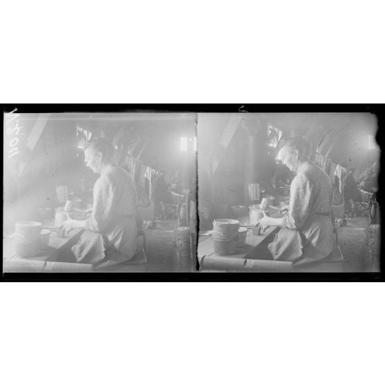 Orléans (Loiret). Ateliers de récupération et de confection d'effets chauds. Débosselage des gamelles (19-9-17).<br>