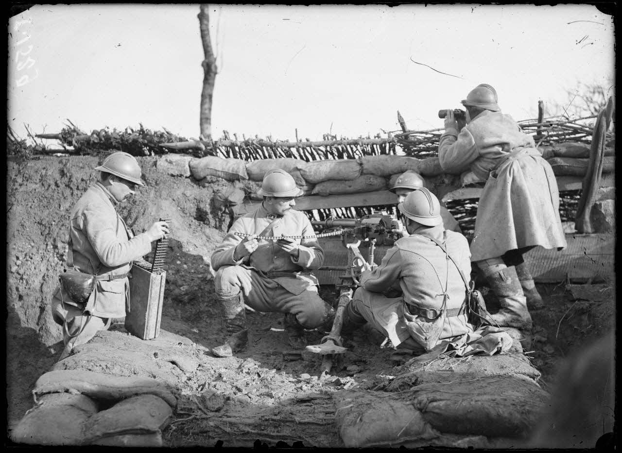 Ouvrage de l'étang de Parroy. Mitrailleuse en action à la tranchée 2. [légende d'origine]