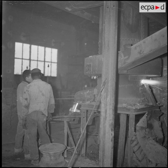 Fonds photographique de Arthur Smet (1932 - ). Ateliers d'apprentissage en mécanique à Saïda et vie quotidienne dans une fonderie de la région.
