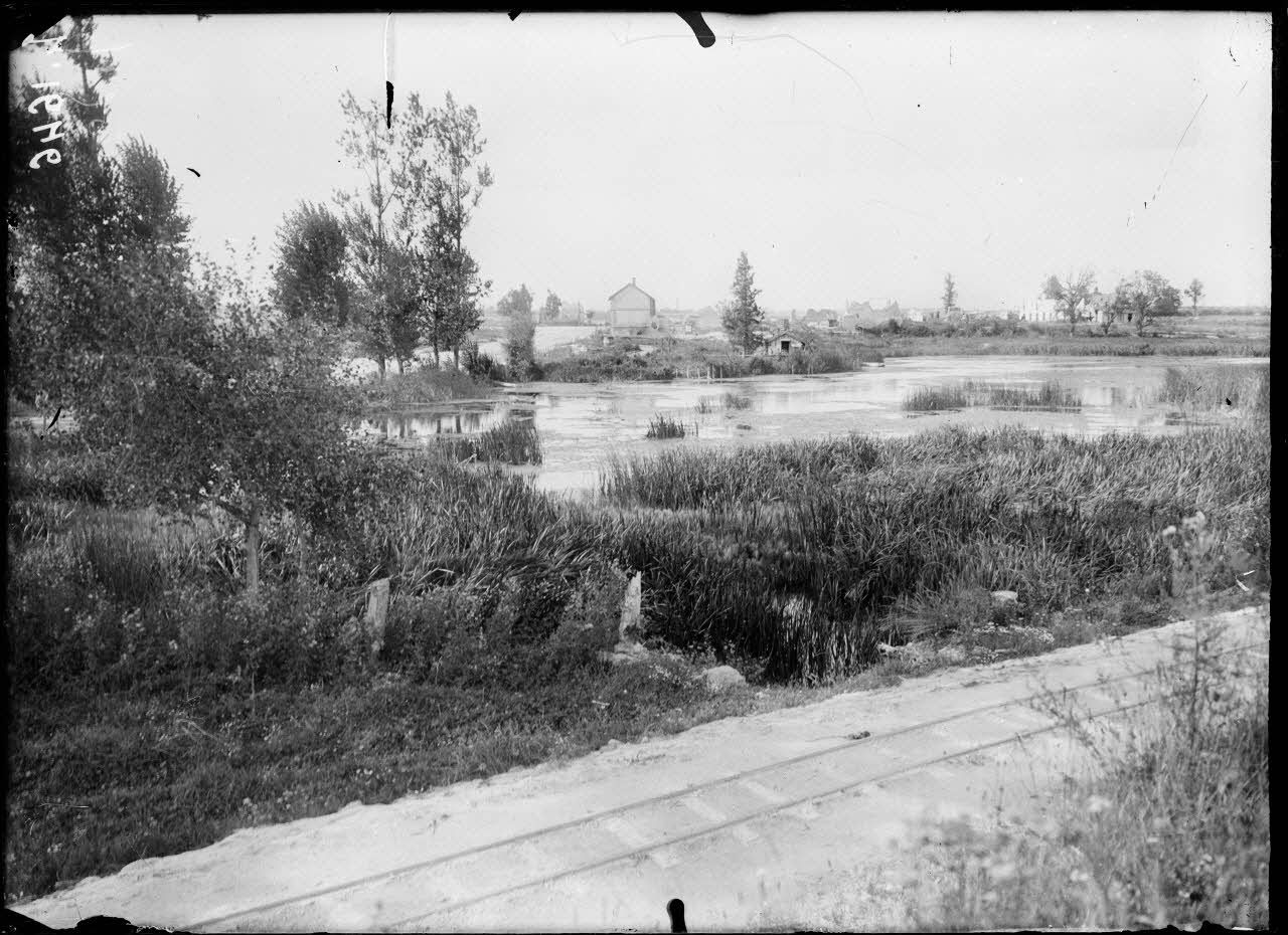 - panorama pris de la Ferme des Wacques (une voie Decauville au premier plan), le moulin ;