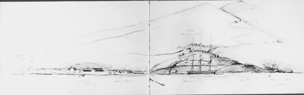 Panorama fait de deux feuilles de dessins relatifs aux installations de la marine française sur la rivière de Tourane (s.d.). [légende d'origine]