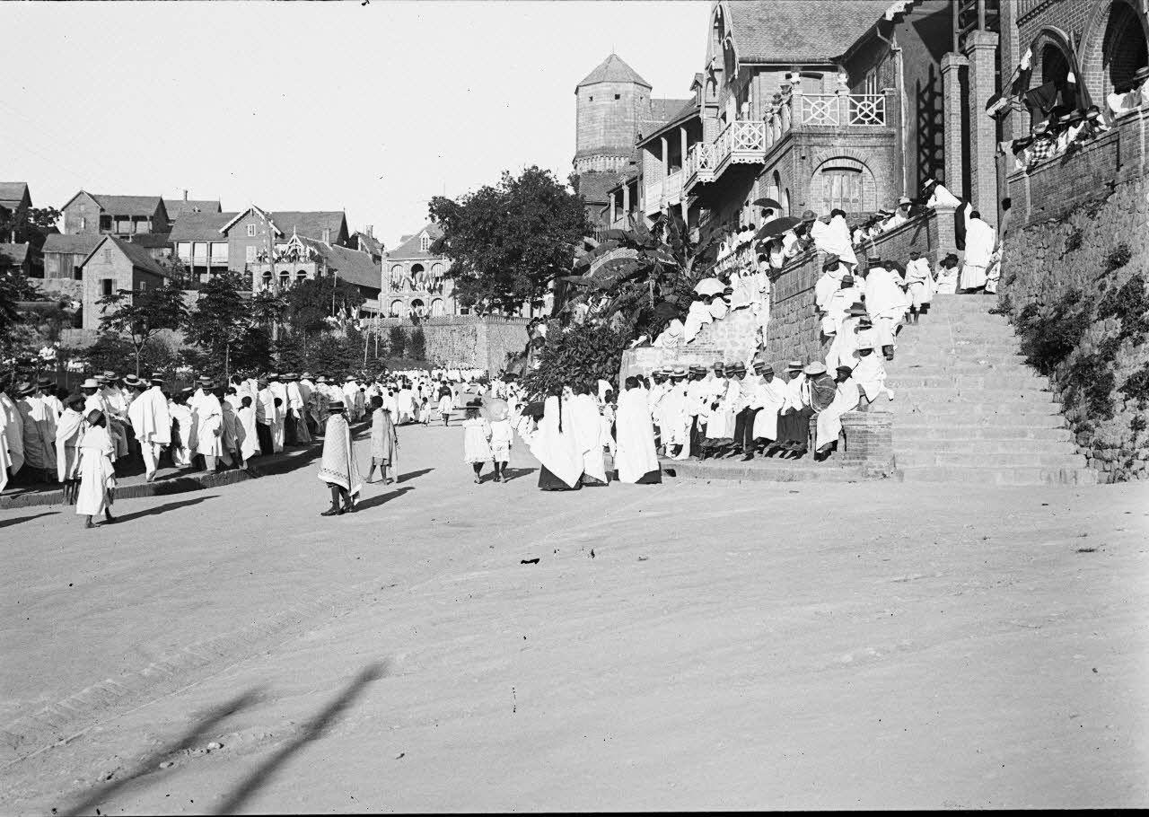 La place d'Andohola. Le kiosque, l'église anglicane et .