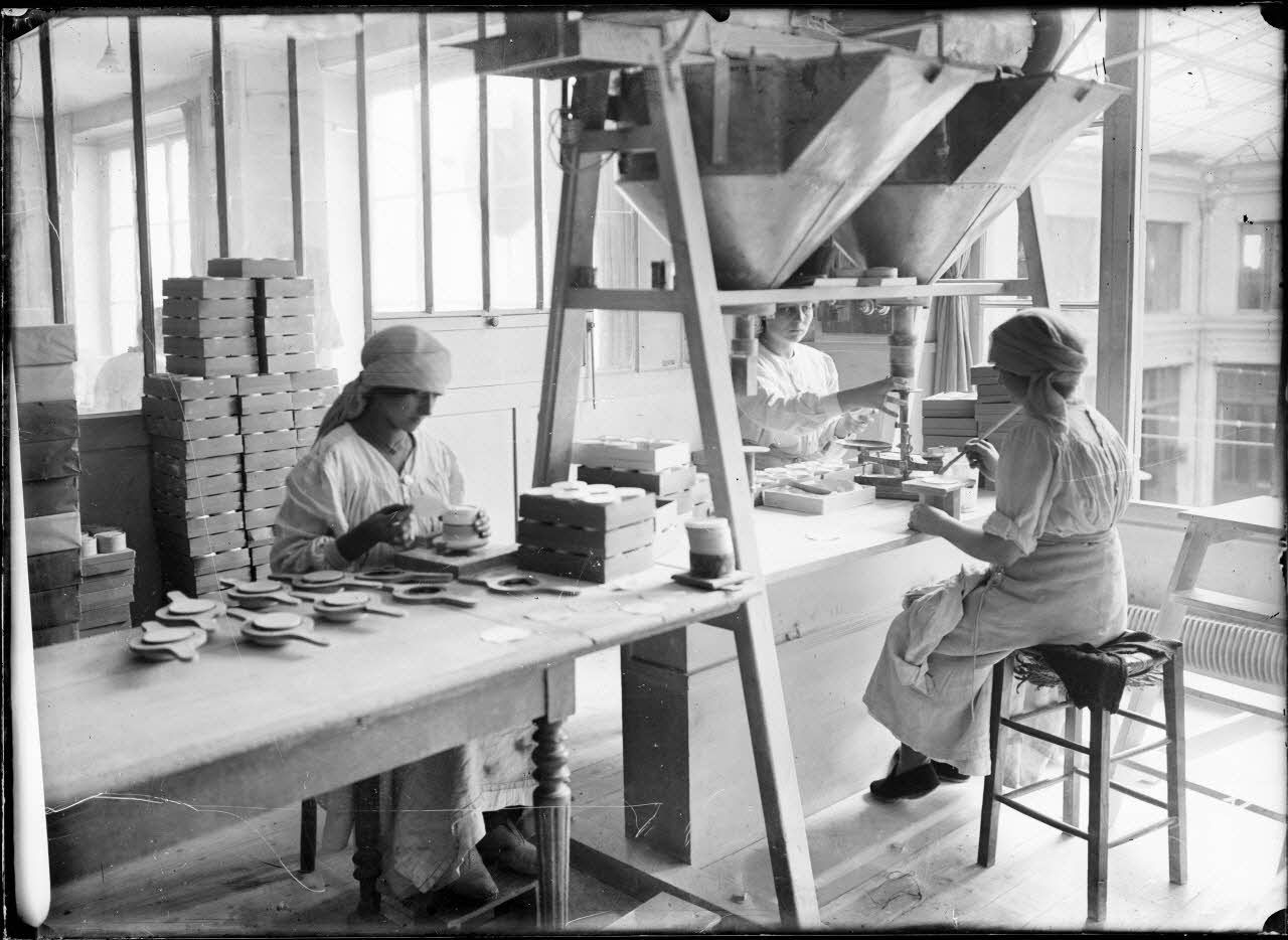 Pantin. Parfumerie Pinaud. 59 rue de Paris. Mise en boîte à l'aide d'une machine, de la poudre de riz Ixora. [légende d'origine]