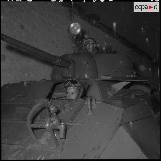Un Français de souche nord-africaine (FSNA), pilote d'automitrailleuse AMC, se prépare à partir en patrouille de nuit.