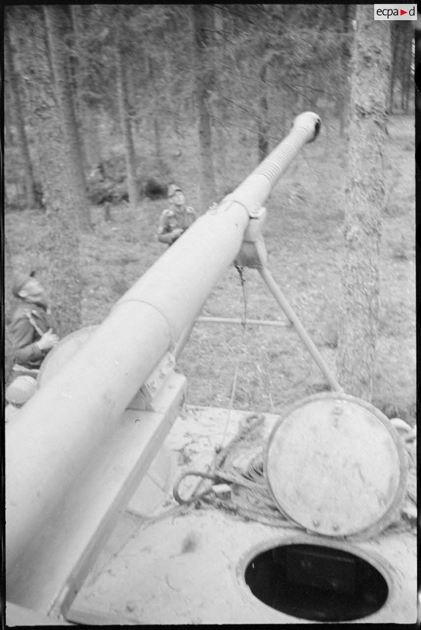 La traversée d'une forêt par des canons automoteurs Nashorn du 519e bataillon lourd de chasseurs de chars (Schwere Panzerjäger Abteilung 519).