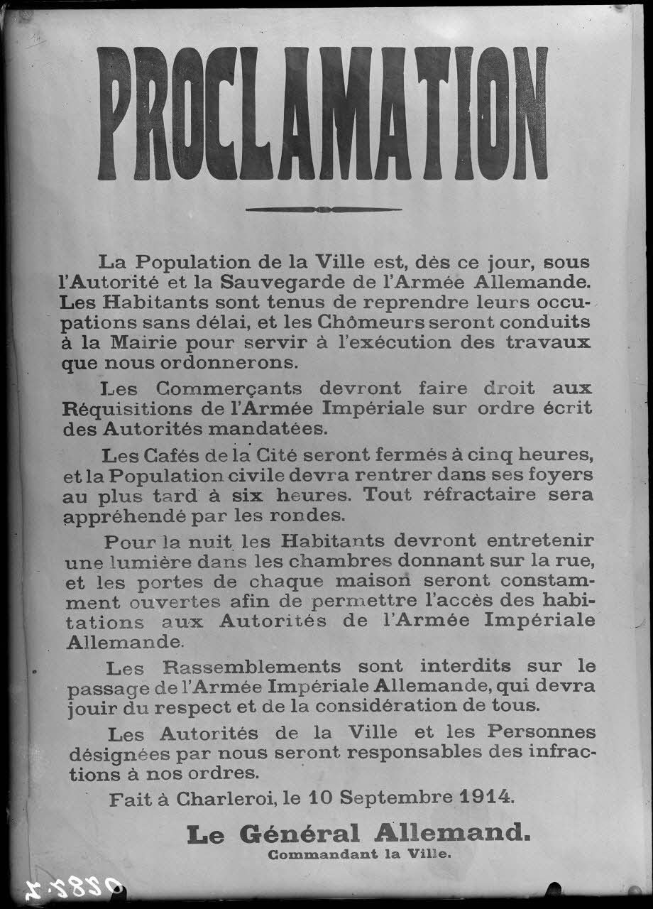Paris, 6 avenue Malakoff. Musée Leblanc. Proclamation allemande à Charleroi. [légende d’origine]