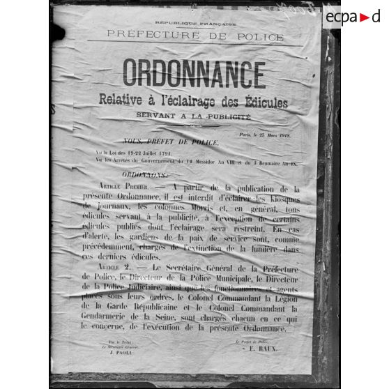 Paris, affiche, ordonnance concernant l'obturation des soupiraux des caves servant d'abris. [légende d'origine]