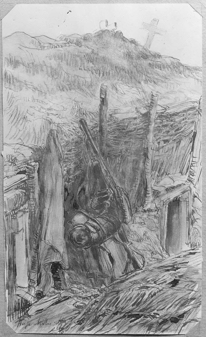 Paris, aux Arts décoratifs, croquis de guerre, de Georges Victor Hugo, Le barda dans une tranchée. [légende d’origine]