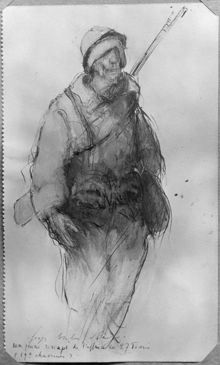 Paris, aux Arts décoratifs, croquis de guerre, de Georges Victor Hugo, Un rescapé de l’affaire du 27 février. [légende d’origine]