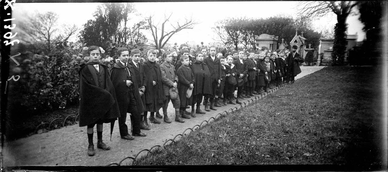 Pour célébrer la Toussaint, les Parisiens se rendent dans les cimetières, dont celui du Père Lachaise. Devant les tombes et au monument aux morts (dont l'auteur est le sculpteur Albert Bartholomé) la foule s'incline sur les tombes et dépose les fleurs. Parmi les veuves, des girls-scouts sont présentes pour rendre hommage aux soldats tombés au front.