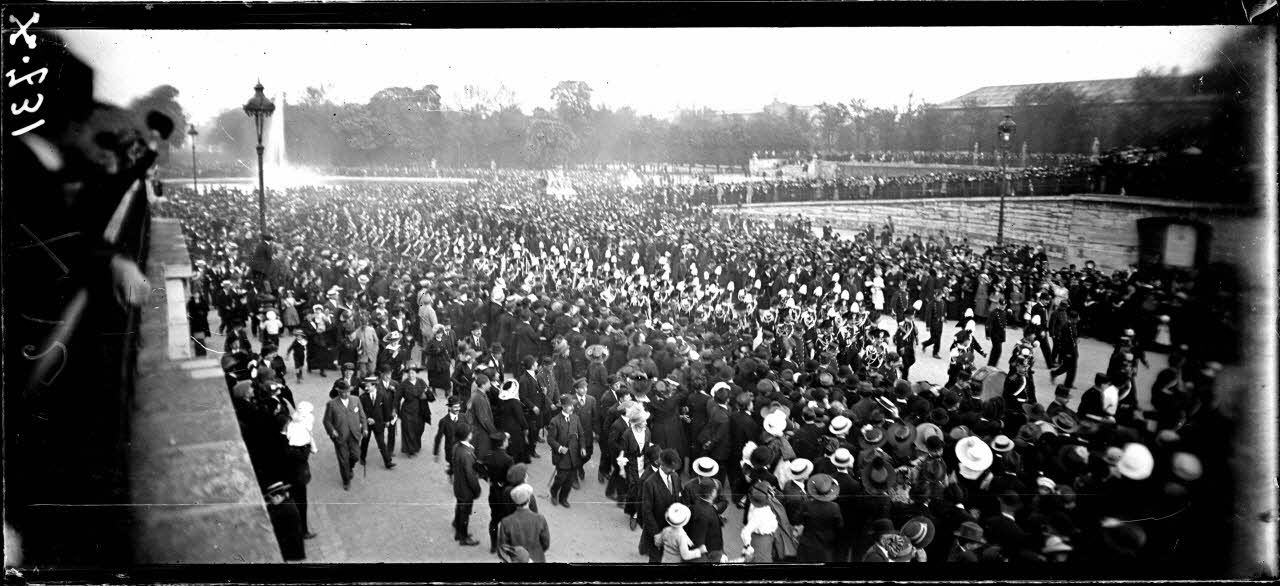Paris. Festival donné au jardin des Tuileries par la musique des Carabiniers royaux d'Italie et la garde républicaine. Arrivée des musiciens italiens.