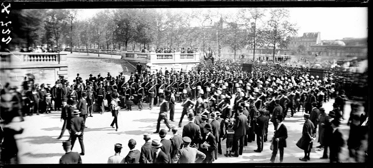 Paris. Festival donné au jardin des Tuileries par la musique des Carabiniers royaux d'Italie et la garde républicaine. Arrivée des musiciens italiens.