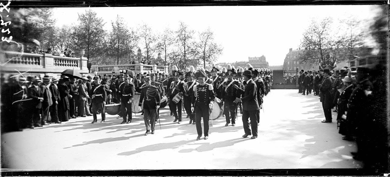 Paris. Festival donné au jardin des Tuileries par la musique des Carabiniers royaux d'Italie et la garde républicaine. Les musiciens des 2 gardes gagnent l'emplacement du concert. [légende d'origine]