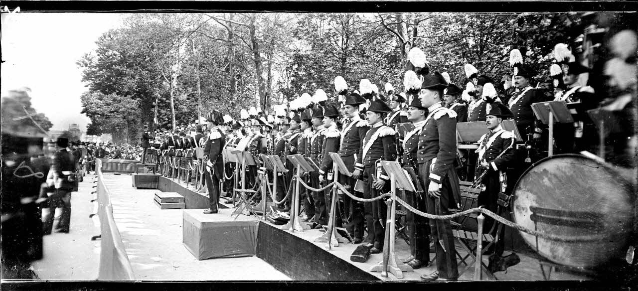 Paris. Festival donné au jardin des Tuileries par la musique des Carabiniers royaux d'Italie et la garde républicaine. Après le concert, défilé des 2 gardes dans le jardin des Tuileries.