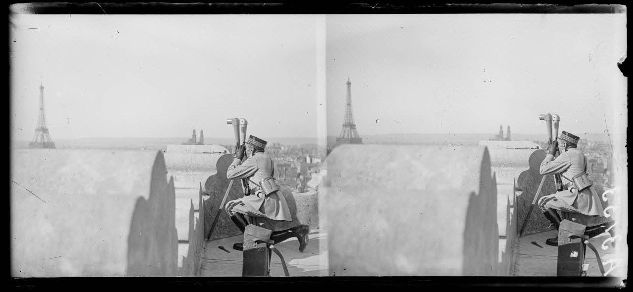 Photographie du général Alby au dessus de l'Arc de Triomphe (A3153), de poilus sur les canons (A3155), des projecteurs sur l'Arc de Triomphe (A3156), de la "saucisse" survolant la capitale (A3158-3159).