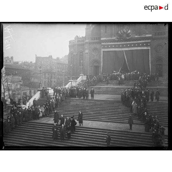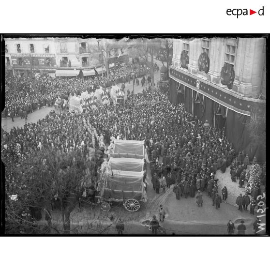 Funérailles des victimes du bombardement du 30 janvier 1915. La foule est rassemblée devant la mairie du 20e arondissement de Paris, sur la place Gambetta.