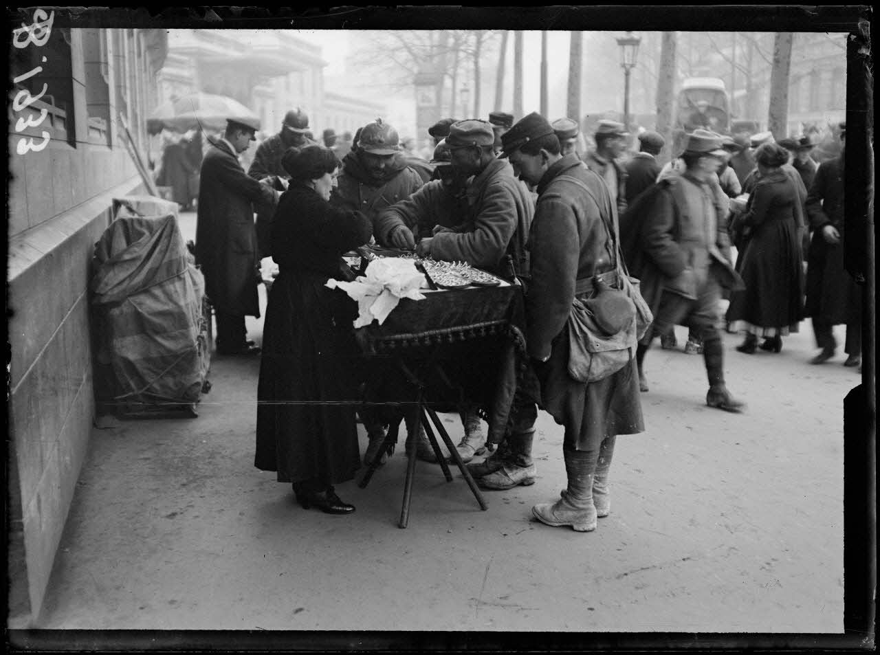 Paris, gare de l’est : les soldats arrivant de permission achètent des bagues en aluminium. [légende d’origine]