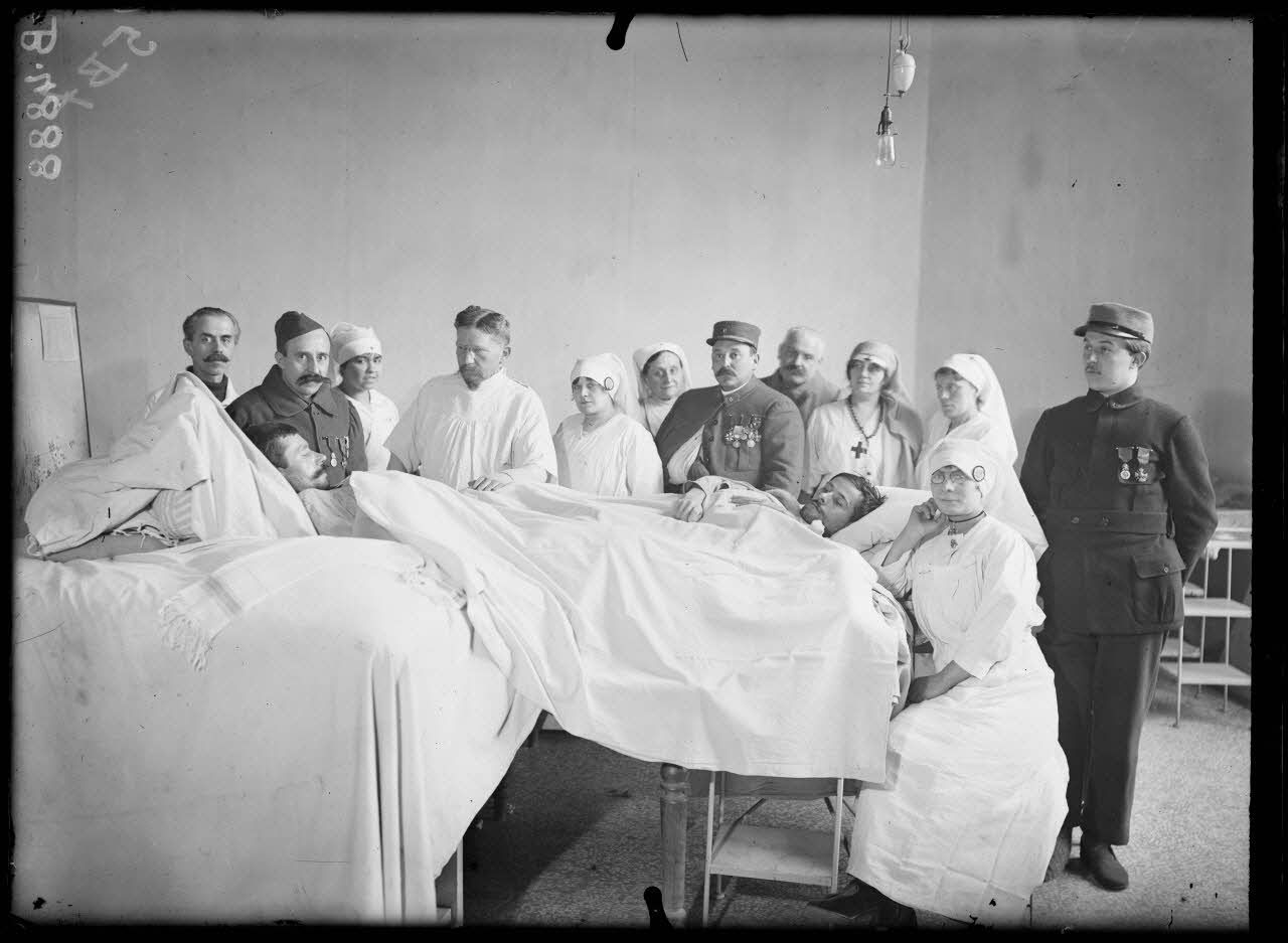 Paris, hôpital du Grand Palais, opération de la greffe des os, par le Dr Laurent. Les deux opérés, les infirmières et le docteur Laurent. [légende d’origine]
