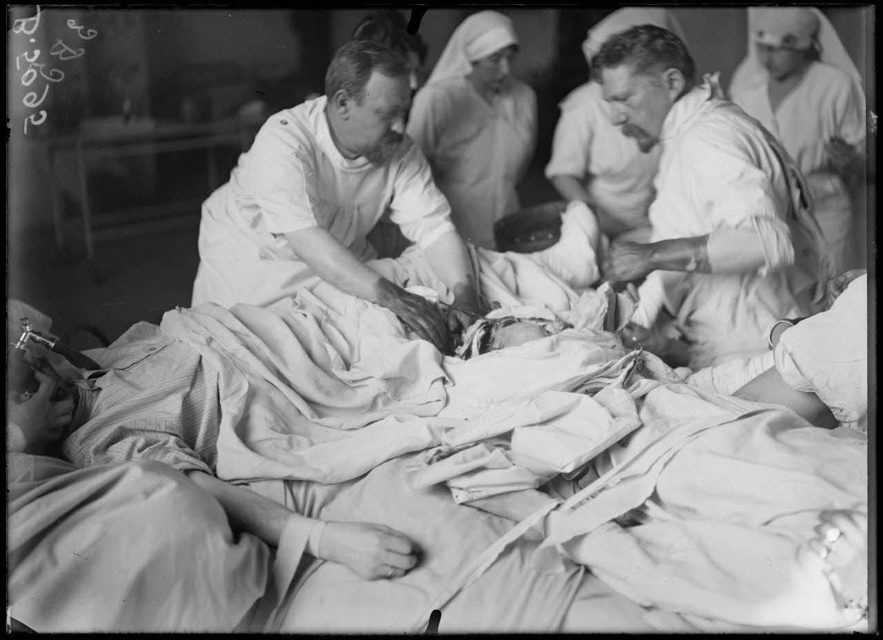 A l'hôpital militaire installé au Grand-Palais, l'opérateur photographie la dernière phase de l'opération de greffe osseuse sur deux soldats mutilés. Il prend aussi des vues de l'ambulance américaine installée au 21 rue Raynouard, dans le 16e arrondissement. Il s'agit du groupe des volontaires de l'AAFS (American Ambulance Field Service) présents en France depuis le début de la guerre pour participer à l'évacuation des blessés.