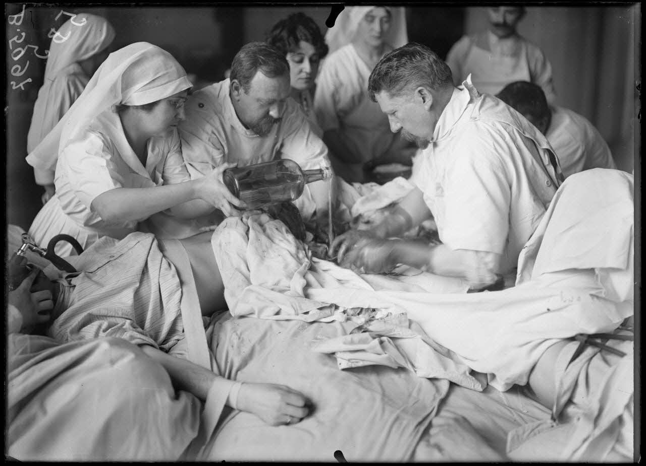 A l'hôpital militaire installé au Grand-Palais, l'opérateur photographie la dernière phase de l'opération de greffe osseuse sur deux soldats mutilés. Il prend aussi des vues de l'ambulance américaine installée au 21 rue Raynouard, dans le 16e arrondissement. Il s'agit du groupe des volontaires de l'AAFS (American Ambulance Field Service) présents en France depuis le début de la guerre pour participer à l'évacuation des blessés.