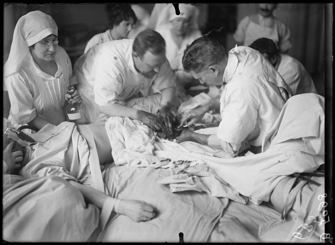 A l'hôpital militaire installé au Grand-Palais, l'opérateur photographie la dernière phase de l'opération de greffe osseuse sur deux soldats mutilés. Il prend aussi des vues de l'ambulance américaine installée au 21 rue Raynouard, dans le 16e arrondissement. Il s'agit du groupe des volontaires de l'AAFS (American Ambulance Field Service) présents en France depuis le début de la guerre pour participer à l'évacuation des blessés.