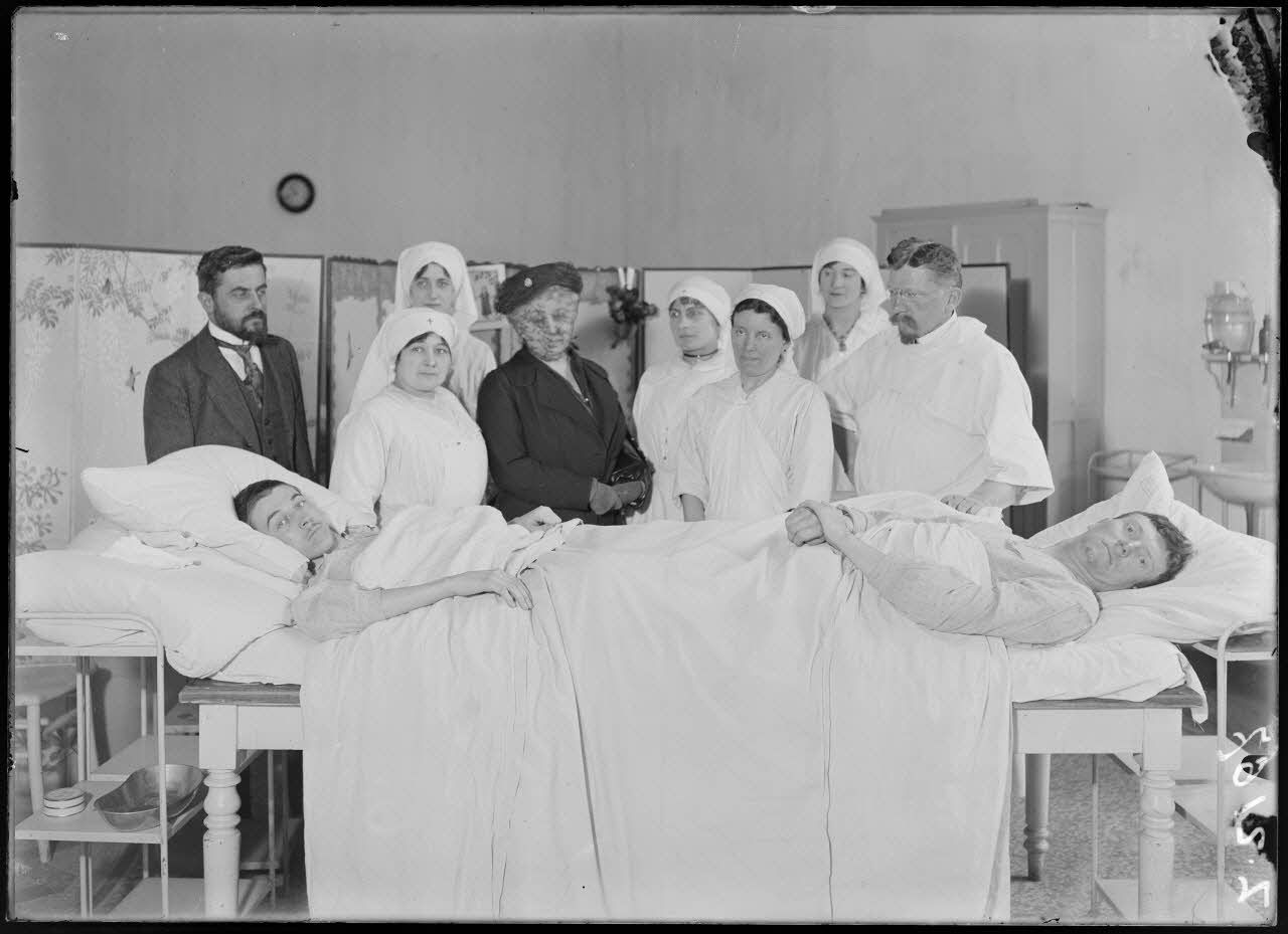Paris. Hôpital du Grand Palais, service du docteur Laurent. Greffe interfémorale. Les 2 blessés dans leur lit commun pendant la greffe intefémorale.