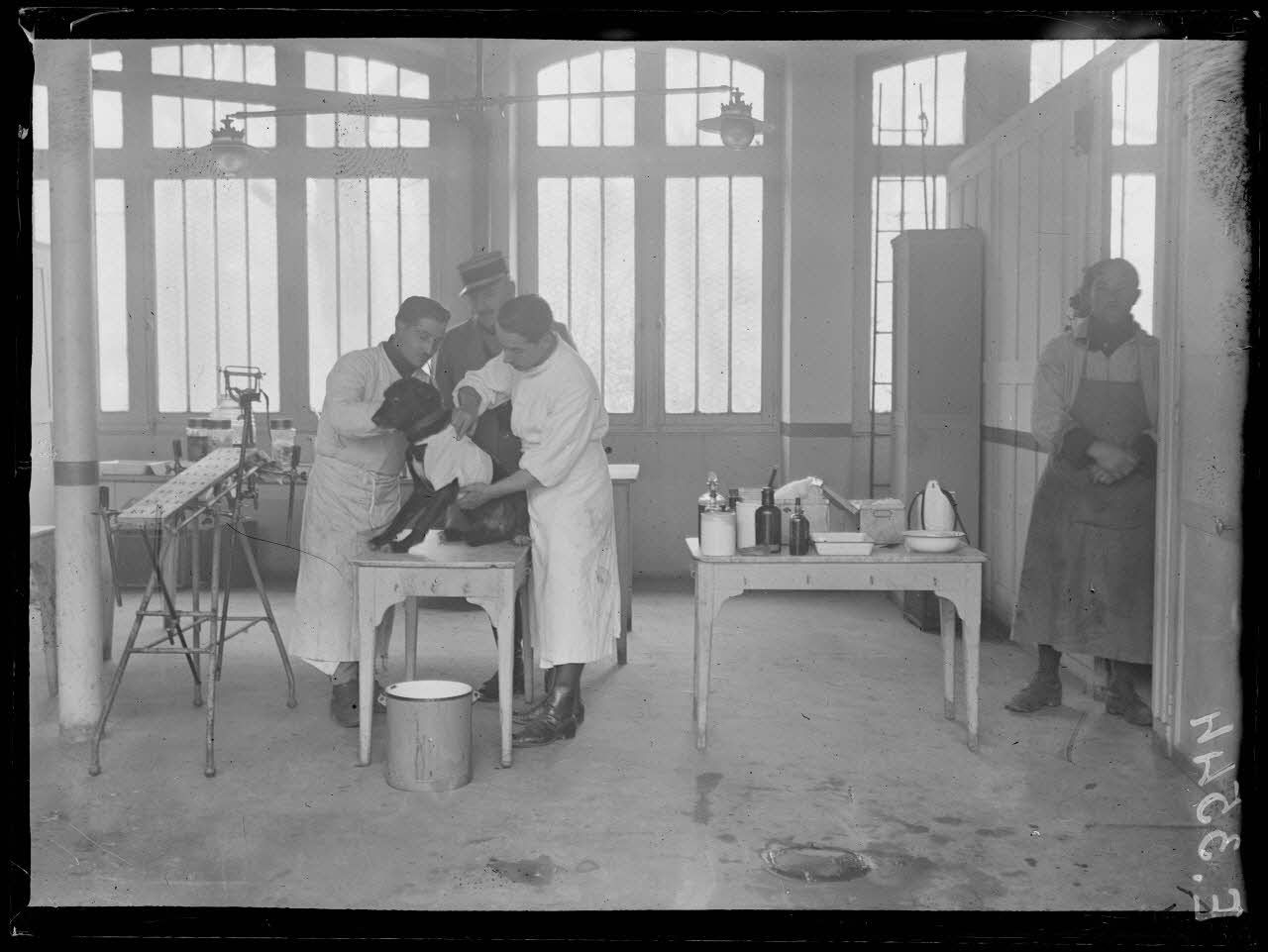 Paris. Hôpital militaire canin de la Bleue Bross. Pansement d'un chien. [légende d'origine]