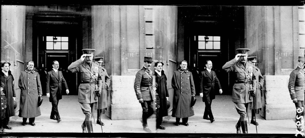 - les ministres britanniques photographiés en plan moyen sortant de la conférence des Alliés tenue dans l'hôtel Crillon ;