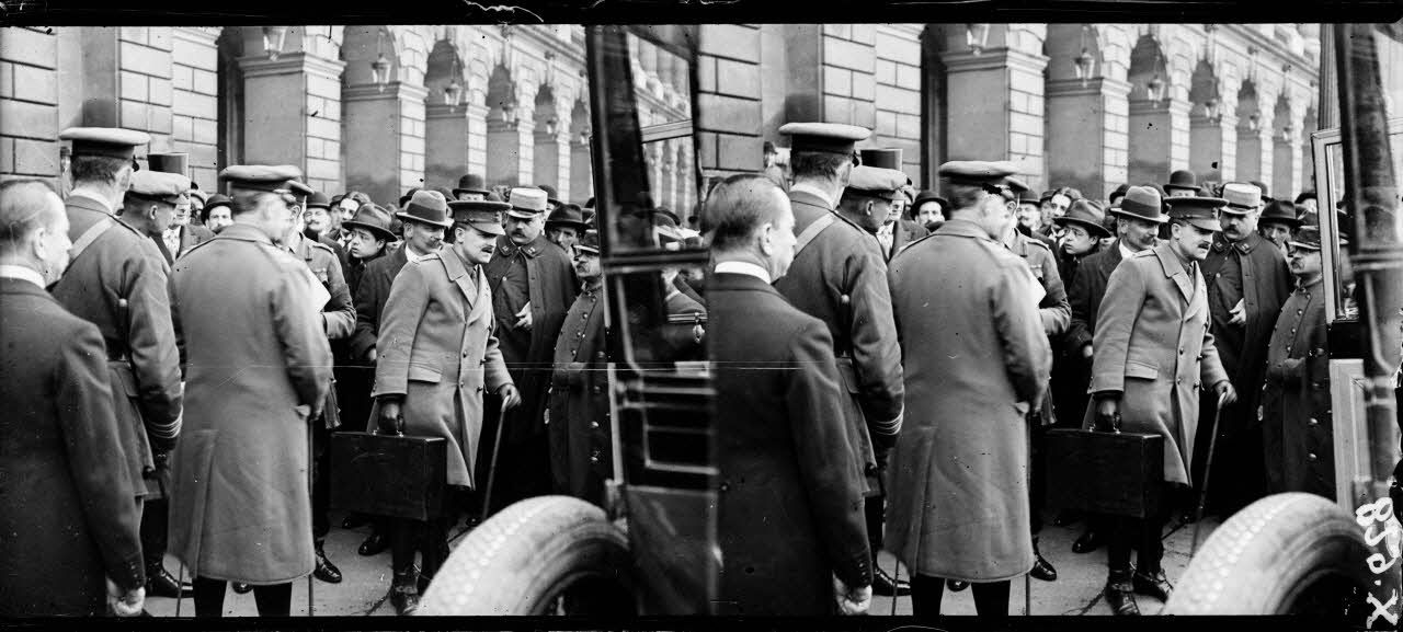 - les ministres britanniques photographiés en plan moyen sortant de la conférence des Alliés tenue dans l'hôtel Crillon ;