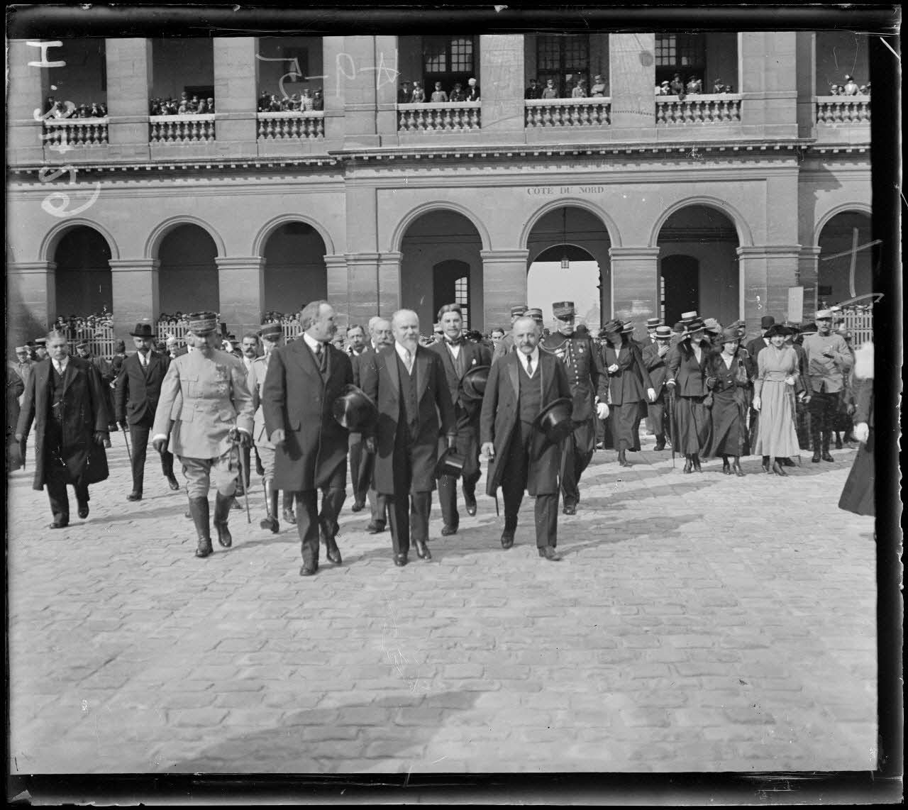 Paris. Hôtel des Invalides. Remise des voitures automobiles de la Croix Rouge roumaine à la France. L'arrivée du Président de la République. A sa droite : Monsieur J. Godar[t] et le général ... A sa gauche : Monsieur Lahovary. Derrière : Monsieur Laurent, préfet de police, le général Duparge. [légende d'origine]