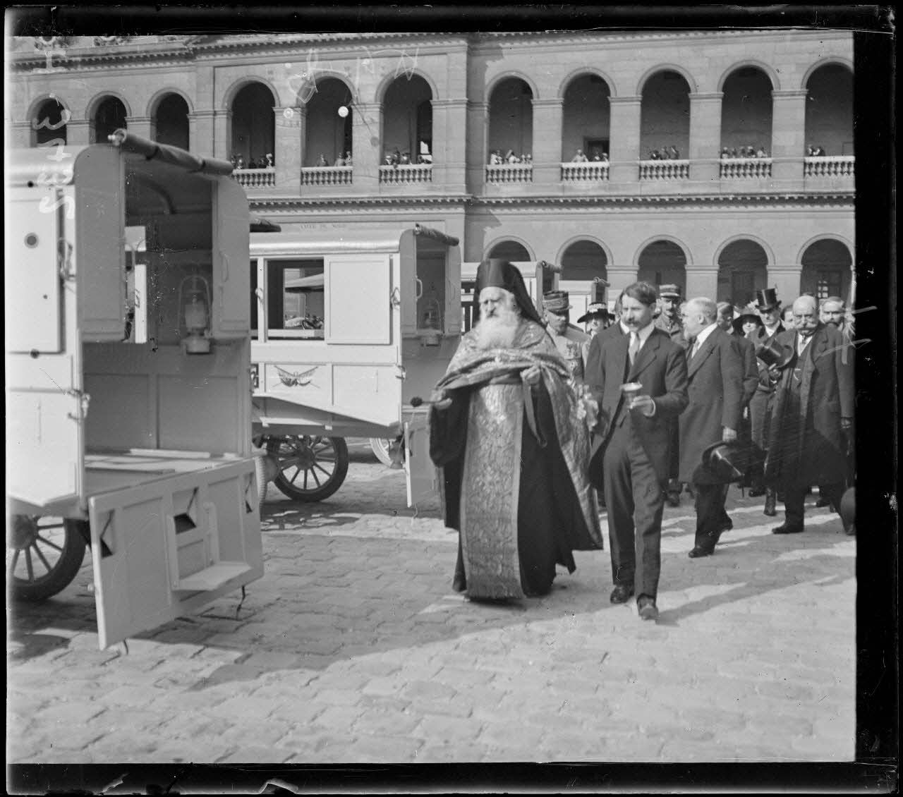 Paris. Hôtel des Invalides. Remise des voitures automobiles de la Croix Rouge roumaine à la France. La bénédiction religieuse. [légende d'origine]