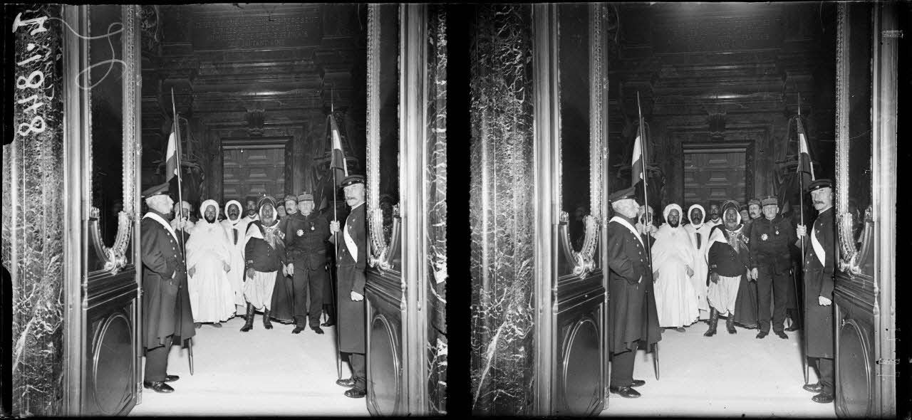 Note : alliée de l'Allemagne, l'Empire Ottoman est donc l'un des ennemis de la Triple Entente. En 1916, le peuple arabe mené par le Chérif de la Mecque, Hussein Ibn Ali, se soulève contre la souveraineté ottomane sur le Hedjaz avec l'aide des Anglais. Le territoire ottoman, en particulier le Hedjaz où se situent tous les lieux saints de l'Islam (La Mecque et Médine), apparaît comme une région stratégique pour la France qui souhaite non seulement conforter sa présence au Moyen-Orient vis-à-vis de l'Empire colonial britannique, mais également se présenter comme "l'amie de l'Islam" selon l'expression des contemporains. Ainsi, le gouvernement français envoie une mission diplomatique à La Mecque pour rencontrer le Chérif et lui apporter son soutien. Celle-ci est composée de "Si Kaddour Ben Ghabrit, chef du protocole de Sa Majesté Chérifienne, chef de la mission. Puis viennent les personnalités suivantes : Agha Sarhaoui, délégué algérien ; Chedly Okby, délégué tunisien ; Si Ahmed Ben El Hadj Skiredji, délégué marocain ; Si Abdou Kane, délégué de l'Afrique Occidentale ; Si Mustapha Cherchali, délégué algérien ; Hadj Larbi Ben ech Cheikh, délégué tunisien ; Kessous Mohamed Ben Youssef, secrétaire de la Mission ; Si Ali Malek, secrétaire de la Mission." En novembre 1916, la mission diplomatique se rend à Paris pour rencontrer des personnalités politiques françaises et étrangères et visiter plusieurs hauts lieux industriels et culturels de la ville.