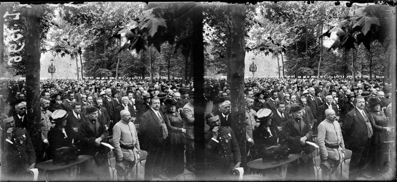 Panorama des spectateurs, civils et militaires, debouts, pour l'hymne national.