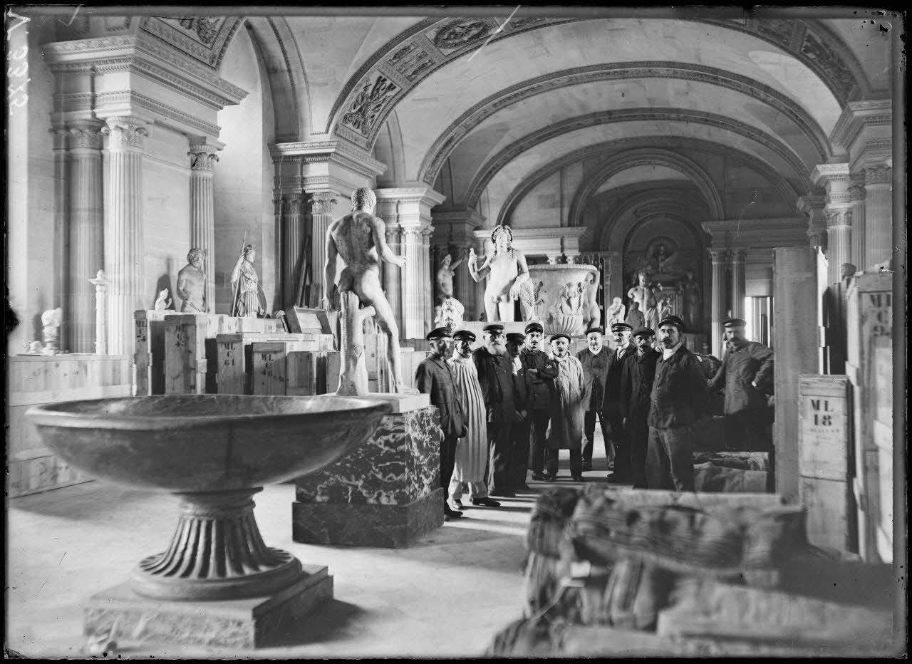 Paris, la réouverture du musée du Louvre. Gardiens et ouvriers dans une salle qui va être ouverte au public. [légende d'origine]