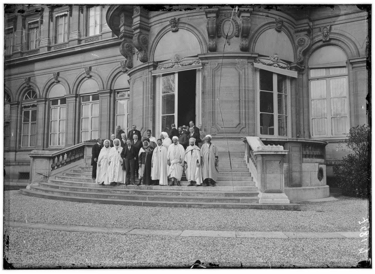 Note : alliée de l'Allemagne, l'Empire Ottoman est donc l'un des ennemis de la Triple Entente. En 1916, le peuple arabe mené par le Chérif de la Mecque, Hussein Ibn Ali, se soulève contre la souveraineté ottomane sur le Hedjaz avec l'aide des Anglais. Le territoire ottoman, en particulier le Hedjaz où se situent tous les lieux saints de l'Islam (La Mecque et Médine), apparaît comme une région stratégique pour la France qui souhaite non seulement conforter sa présence au Moyen-Orient vis-à-vis de l'Empire colonial britannique, mais également se présenter comme "l'amie de l'Islam" selon l'expression des contemporains. Ainsi, le gouvernement français envoie une mission diplomatique à La Mecque pour rencontrer le Chérif et lui apporter son soutien. Celle-ci est composée de "Si Kaddour Ben Ghabrit, chef du protocole de Sa Majesté Chérifienne, chef de la mission. Puis viennent les personnalités suivantes : Agha Sarhaoui, délégué algérien ; Chedly Okby, délégué tunisien ; Si Ahmed Ben El Hadj Skiredji, délégué marocain ; Si Abdou Kane, délégué de l'Afrique Occidentale ; Si Mustapha Cherchali, délégué algérien ; Hadj Larbi Ben ech Cheikh, délégué tunisien ; Kessous Mohamed Ben Youssef, secrétaire de la Mission ; Si Ali Malek, secrétaire de la Mission." En novembre 1916, la mission diplomatique se rend à Paris pour rencontrer des personnalités politiques françaises et étrangères et visiter plusieurs hauts lieux industriels et culturels de la ville.