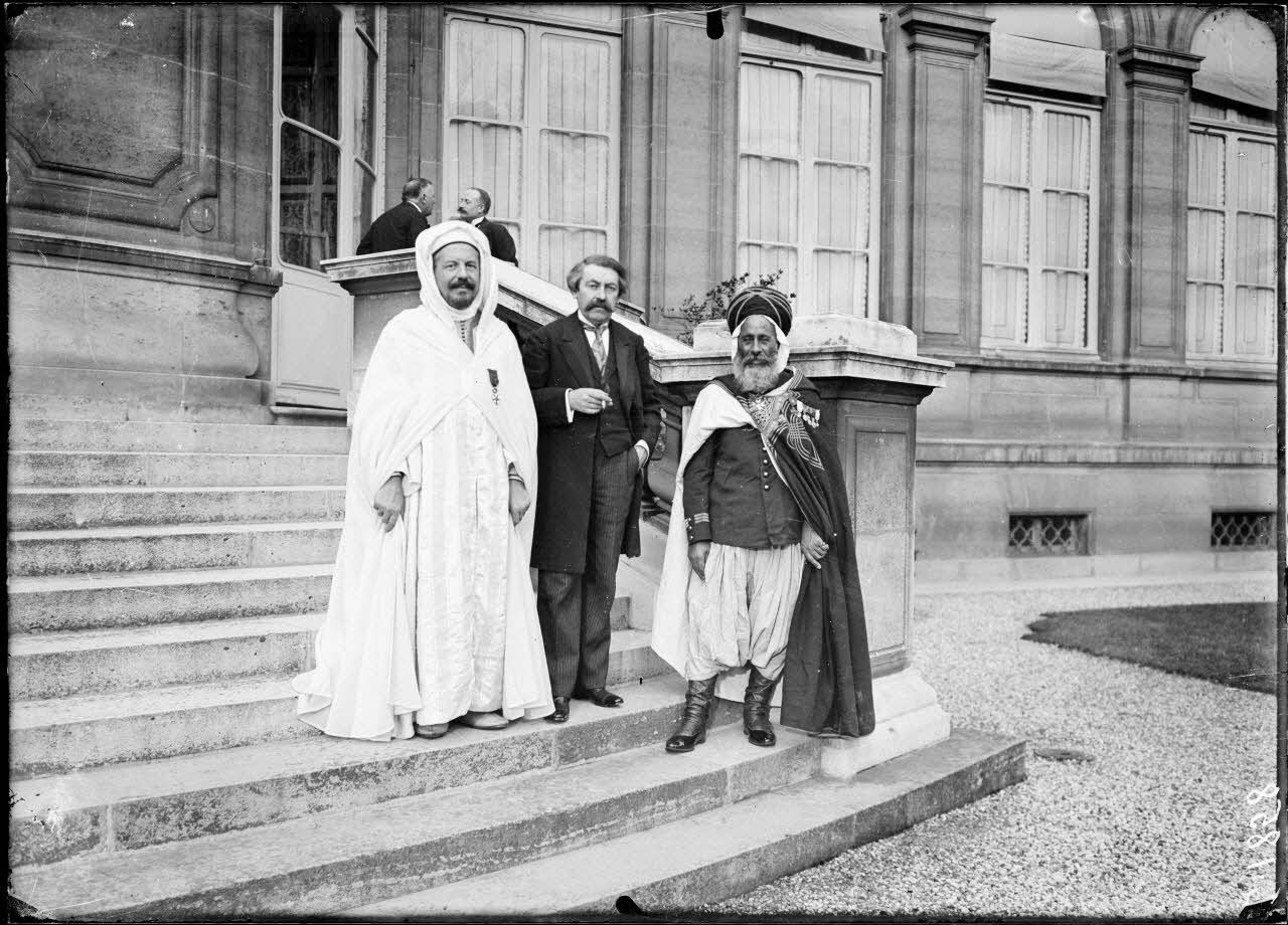 Note : alliée de l'Allemagne, l'Empire Ottoman est donc l'un des ennemis de la Triple Entente. En 1916, le peuple arabe mené par le Chérif de la Mecque, Hussein Ibn Ali, se soulève contre la souveraineté ottomane sur le Hedjaz avec l'aide des Anglais. Le territoire ottoman, en particulier le Hedjaz où se situent tous les lieux saints de l'Islam (La Mecque et Médine), apparaît comme une région stratégique pour la France qui souhaite non seulement conforter sa présence au Moyen-Orient vis-à-vis de l'Empire colonial britannique, mais également se présenter comme "l'amie de l'Islam" selon l'expression des contemporains. Ainsi, le gouvernement français envoie une mission diplomatique à La Mecque pour rencontrer le Chérif et lui apporter son soutien. Celle-ci est composée de "Si Kaddour Ben Ghabrit, chef du protocole de Sa Majesté Chérifienne, chef de la mission. Puis viennent les personnalités suivantes : Agha Sarhaoui, délégué algérien ; Chedly Okby, délégué tunisien ; Si Ahmed Ben El Hadj Skiredji, délégué marocain ; Si Abdou Kane, délégué de l'Afrique Occidentale ; Si Mustapha Cherchali, délégué algérien ; Hadj Larbi Ben ech Cheikh, délégué tunisien ; Kessous Mohamed Ben Youssef, secrétaire de la Mission ; Si Ali Malek, secrétaire de la Mission." En novembre 1916, la mission diplomatique se rend à Paris pour rencontrer des personnalités politiques françaises et étrangères et visiter plusieurs hauts lieux industriels et culturels de la ville.