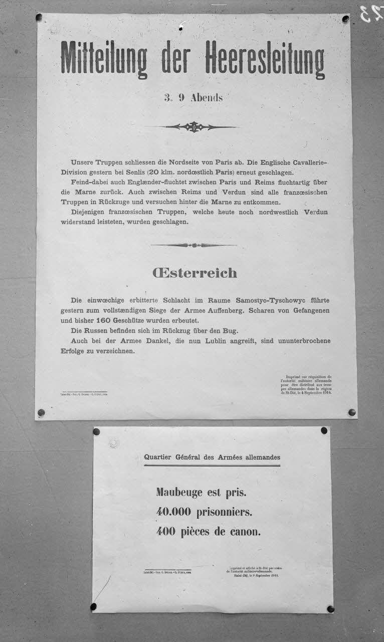 Paris. Musée franco-américain. Métro Leblanc. 6 avenue Malakoff. 2 affiches. 1. Mitteilung der Heeresleitung. 2. Maubeuge est pris. [légende d'origine]