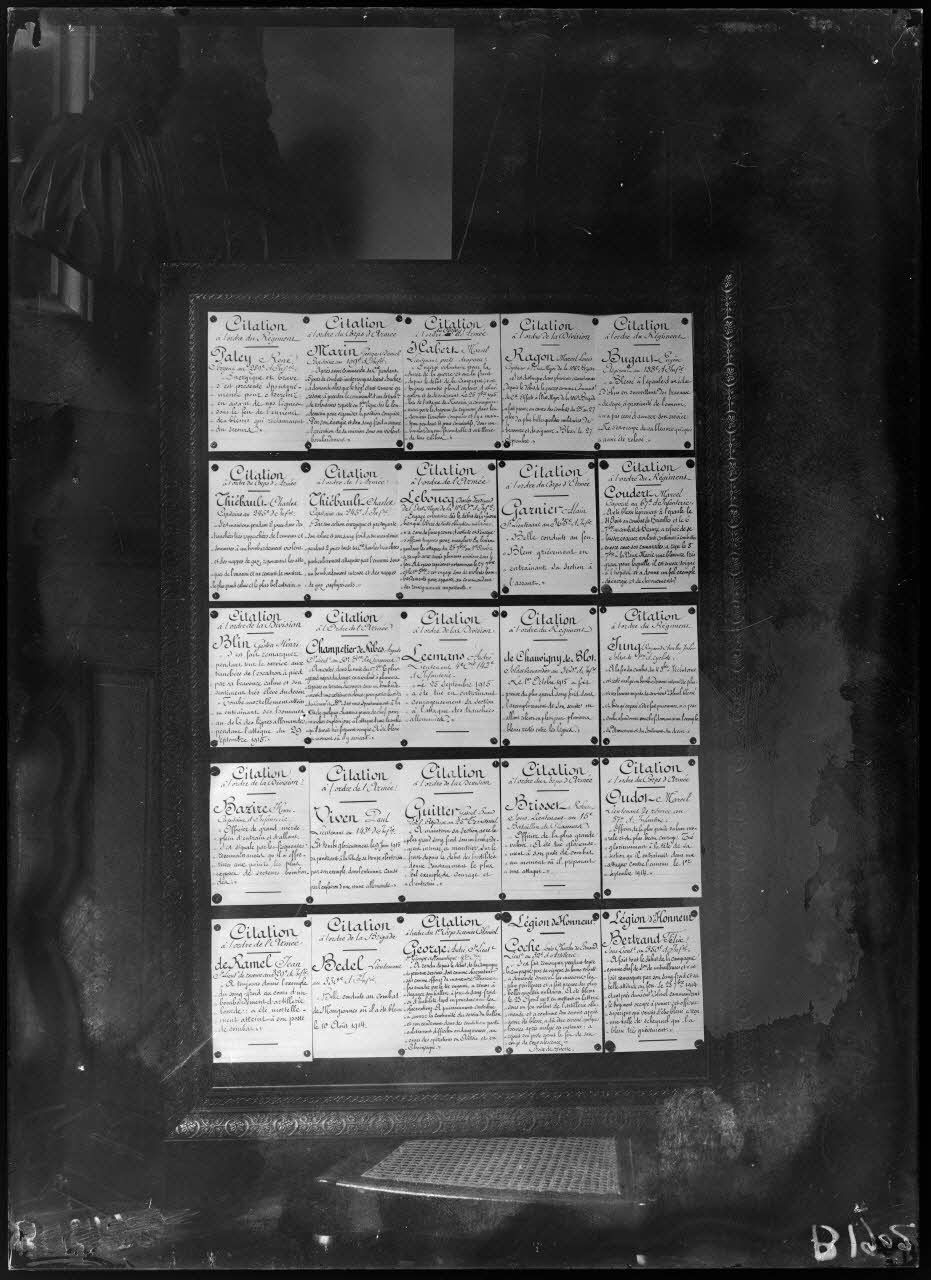 Seules 5 plaques existent sur une centaine mentionnées dans le registre. Le registre ne comporte aucune date. La période est déduite d'après les reportages des opérateurs Jacques Agié et Albert Moreau sur le même sujet.