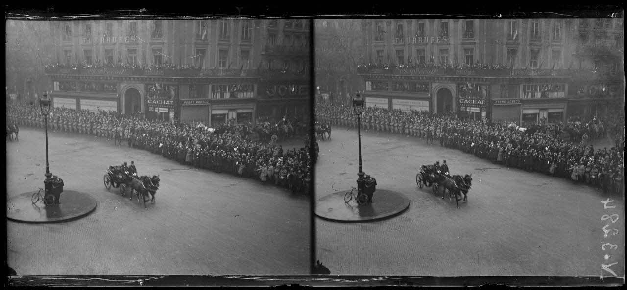 Albert 1er, roi des Belges, arrive à Paris pour préparer les négociations de Paix. Une foule s'est massée sur le passage du convoi officiel, traversant Paris et la place de l'opéra.