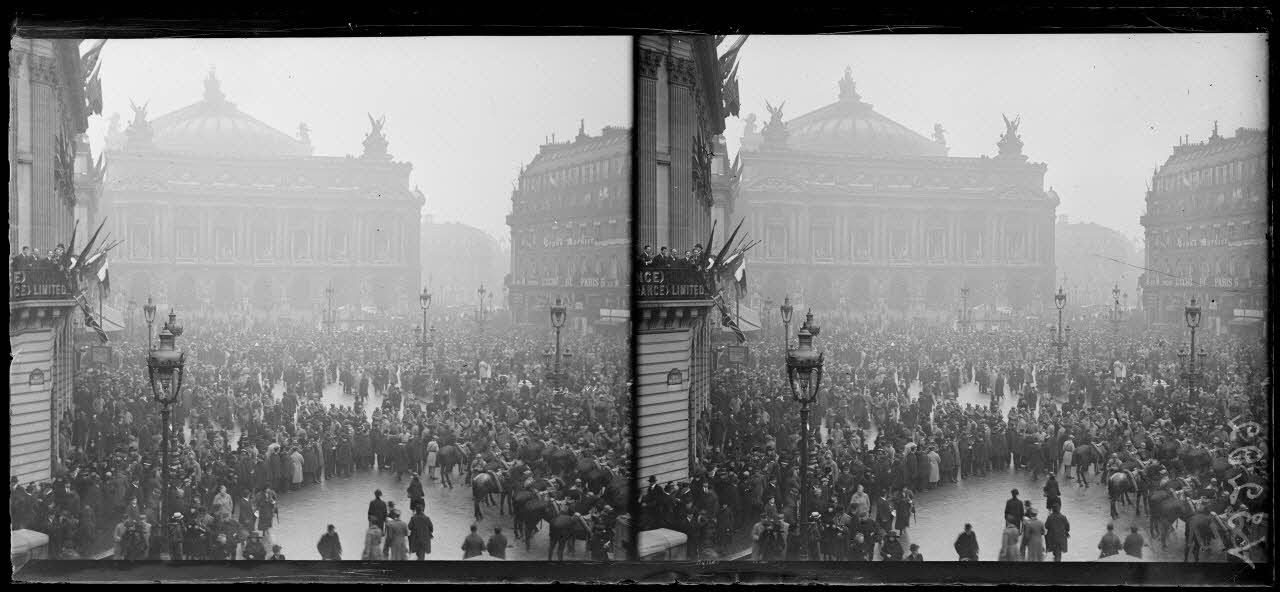 Albert 1er, roi des Belges, arrive à Paris pour préparer les négociations de Paix. Une foule s'est massée sur le passage du convoi officiel, traversant Paris et la place de l'opéra.