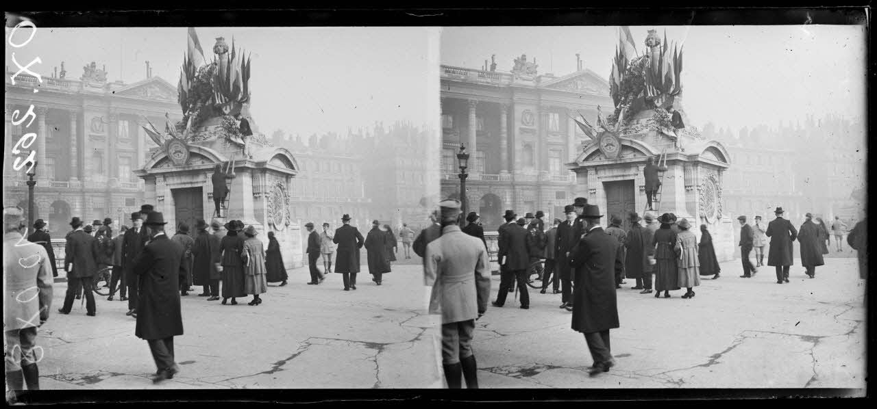 Paris, place de la Concorde, la statue de Lille, le jour de la délivrance de la ville, Lillois devant la statue.