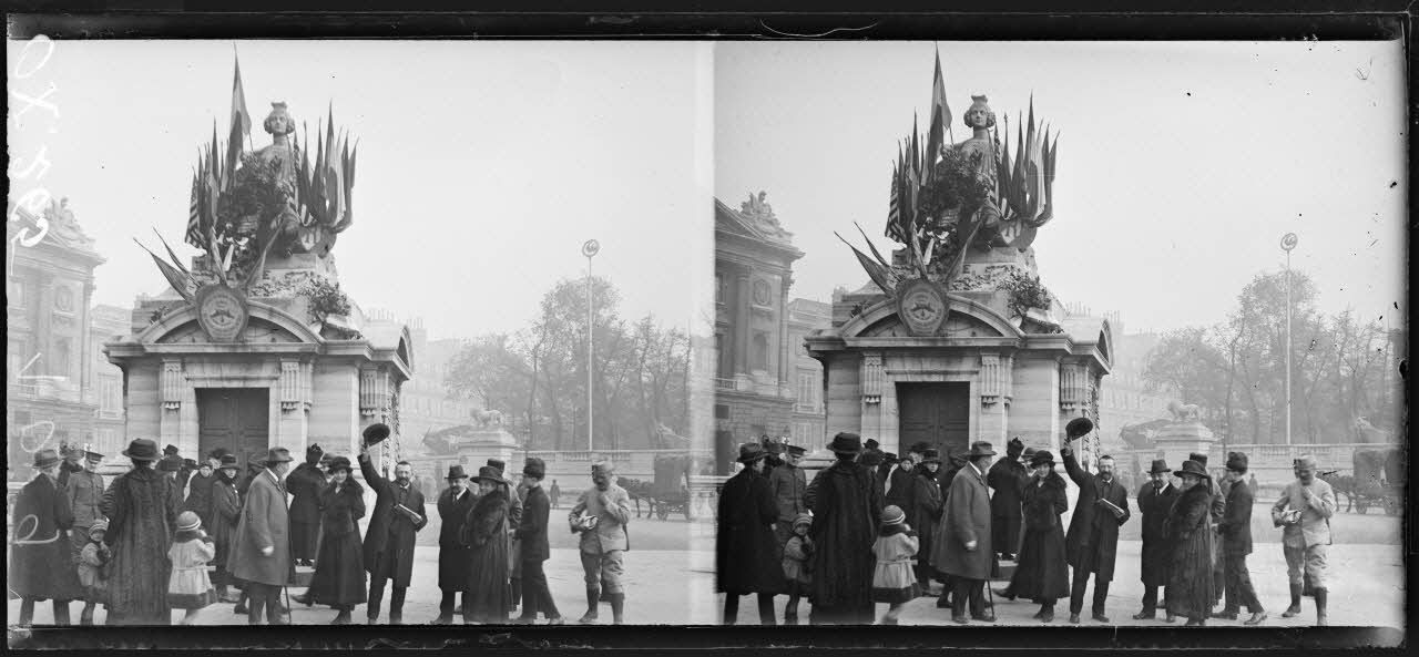 Paris, place de la Concorde, la statue de Lille, le jour de la délivrance de la ville, Lillois devant la statue.