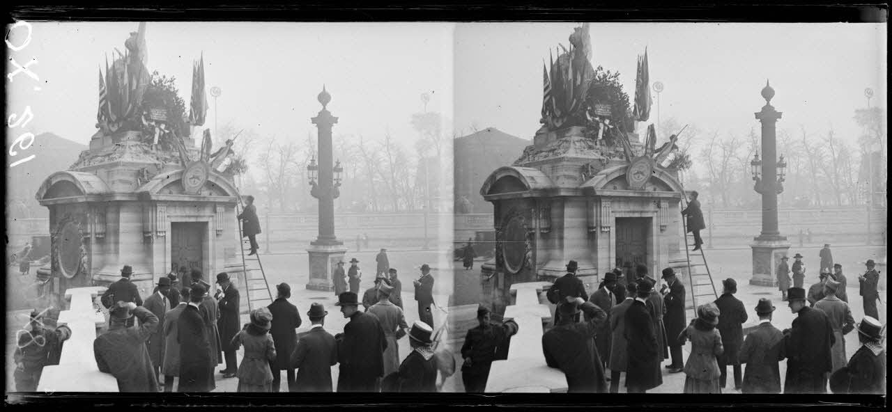 Paris, place de la Concorde, la statue de Lille, le jour de la délivrance de la ville, Lillois devant la statue.