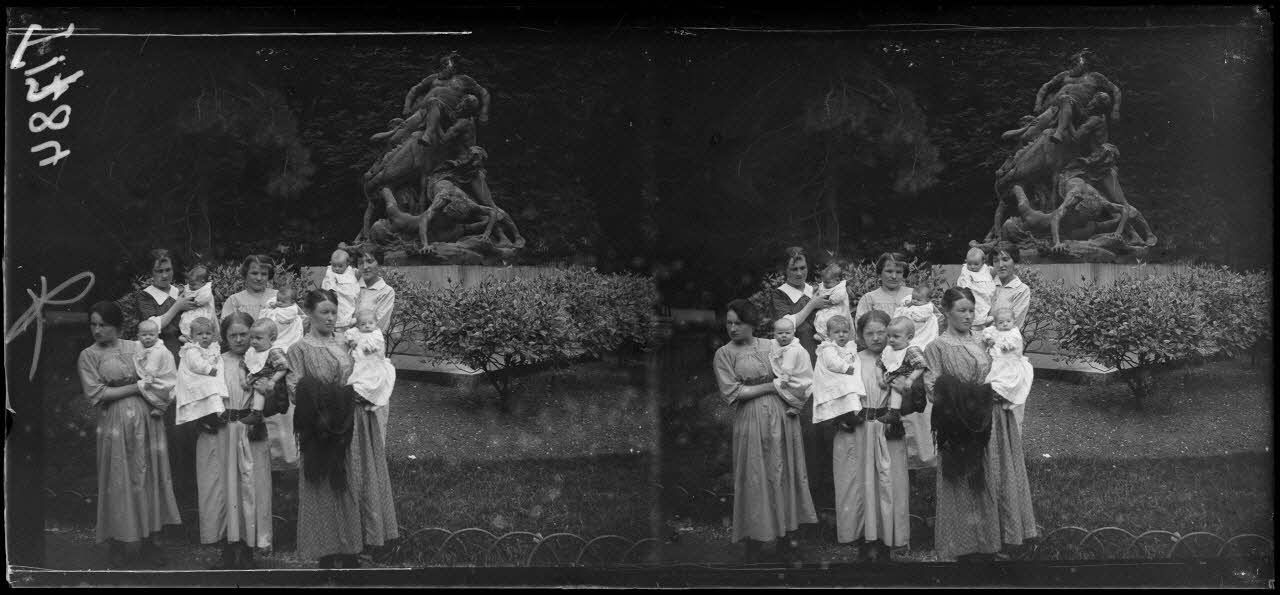 Les nourrissons dans leurs berceaux et dans les bras de femmes au jardin du luxembourg.
