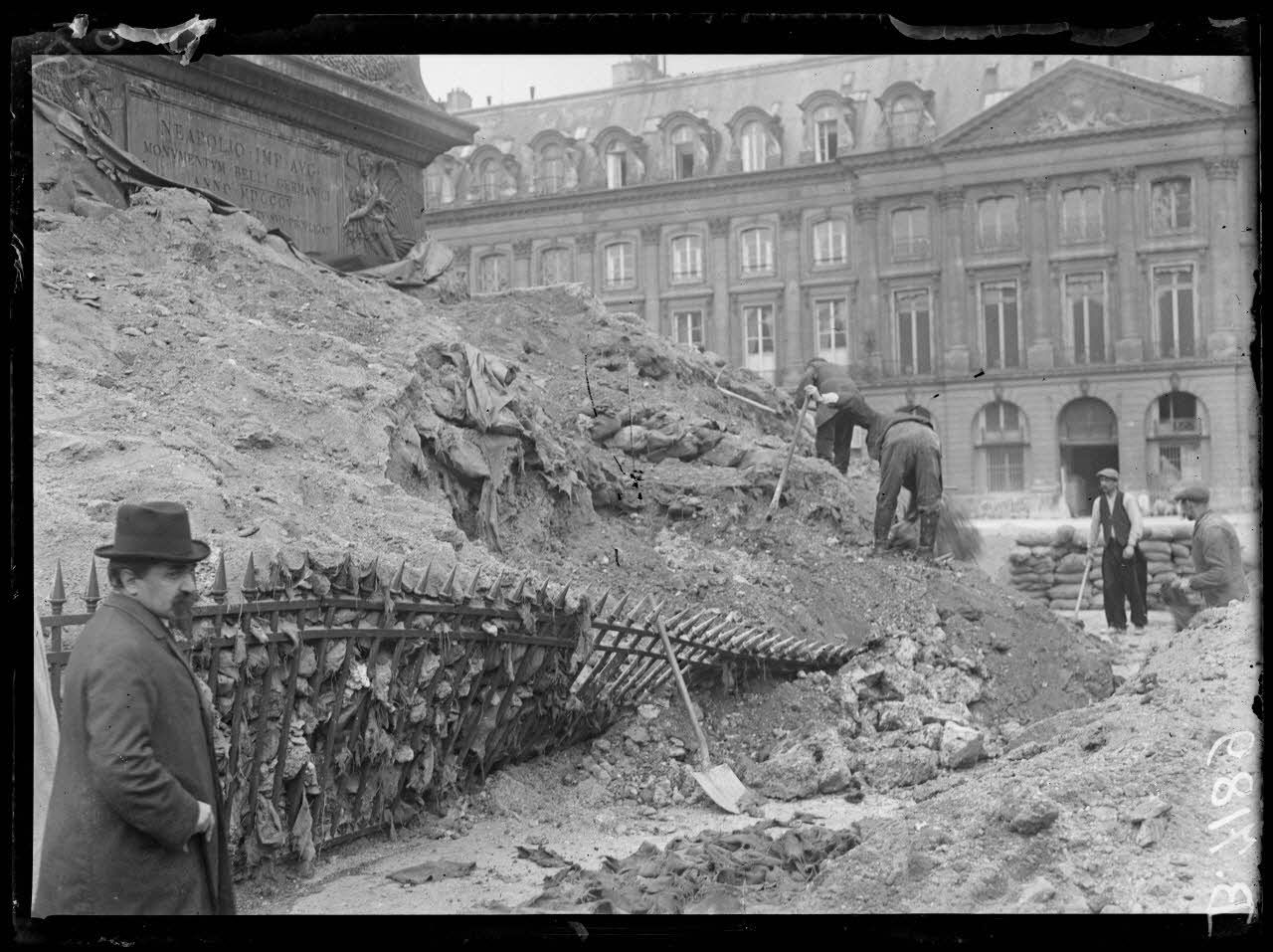 Paris, protection des monuments. Eboulement des sacs de protection de la colonne Vendôme. [légende d'origine]