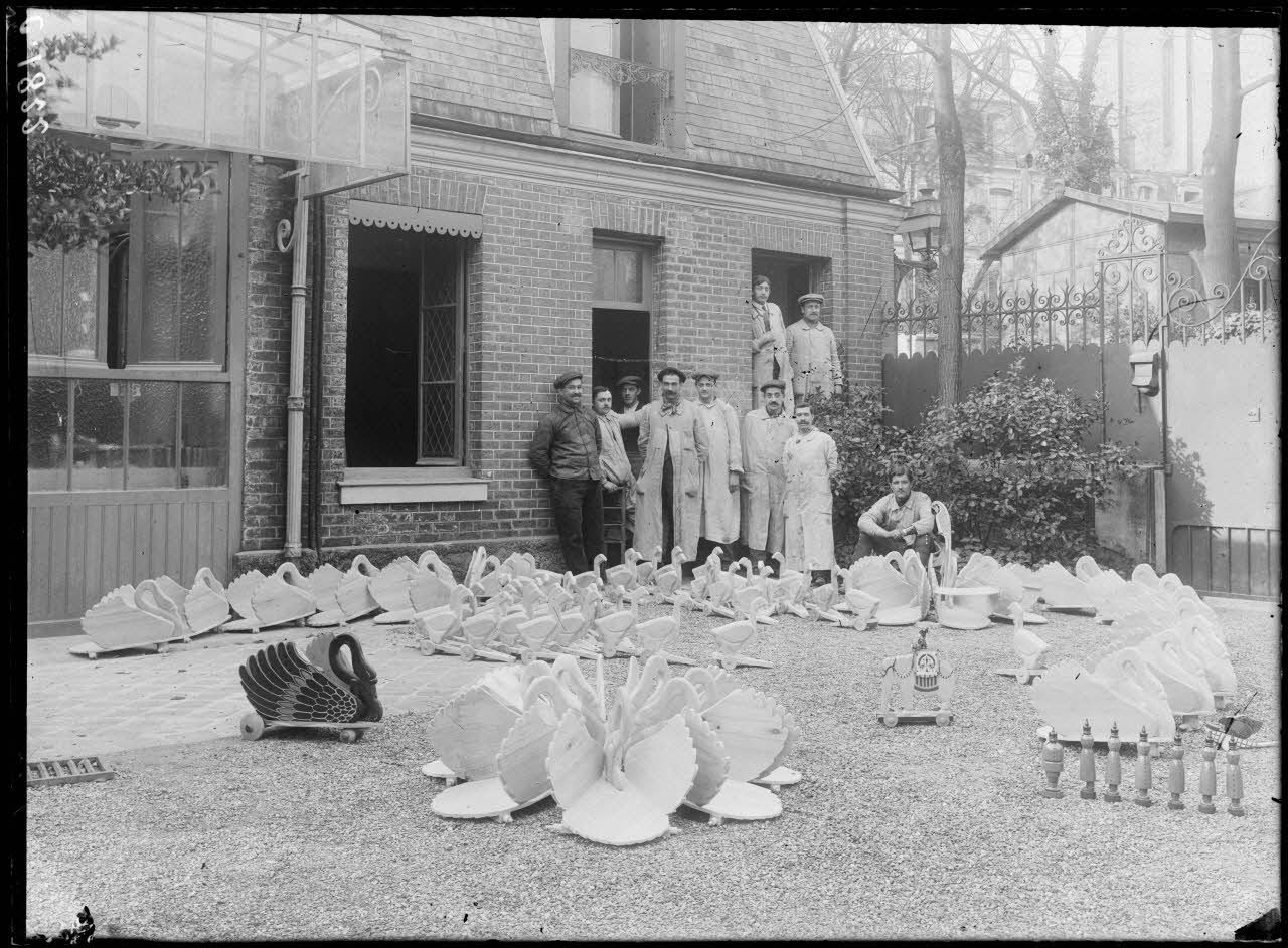 Paris. Réeducation des mutilés. Ateliers 4 av.Montespan. Cygnes, oies, canards, jouets à passer à l'atelier de peinture. [légende d'origine]