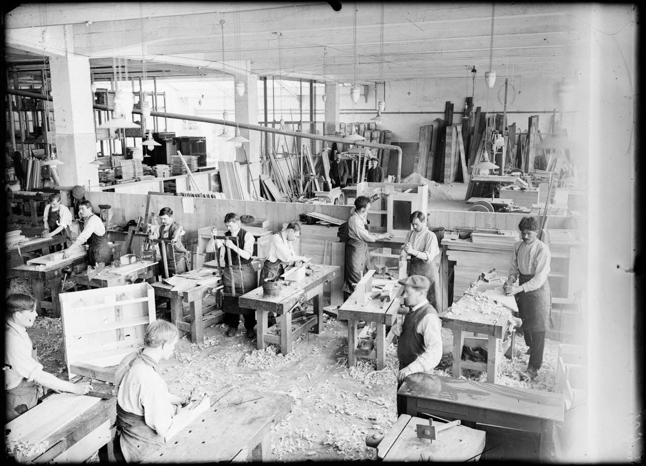 Paris. Rue de la Durance. Ecole professionnelle pour mutilés. Atelier de menuiserie. Amputés munis de bras artificiels. [légende d'origine]
